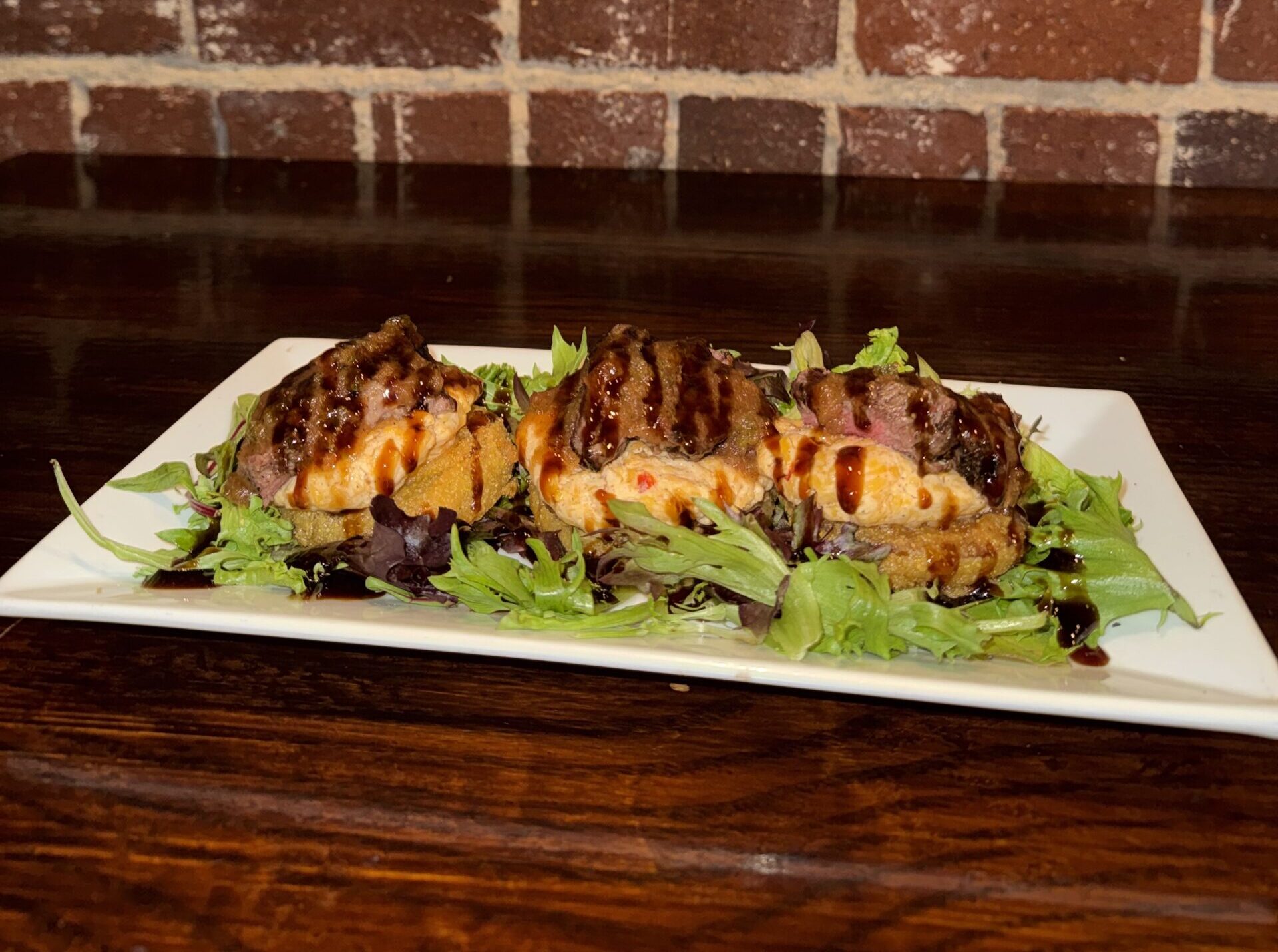 Layered fried green tomatoes covered in local, stone-ground cornmeal and pimento cheese, topped with a petite filet mignon with tomato jam and balsamic reduction