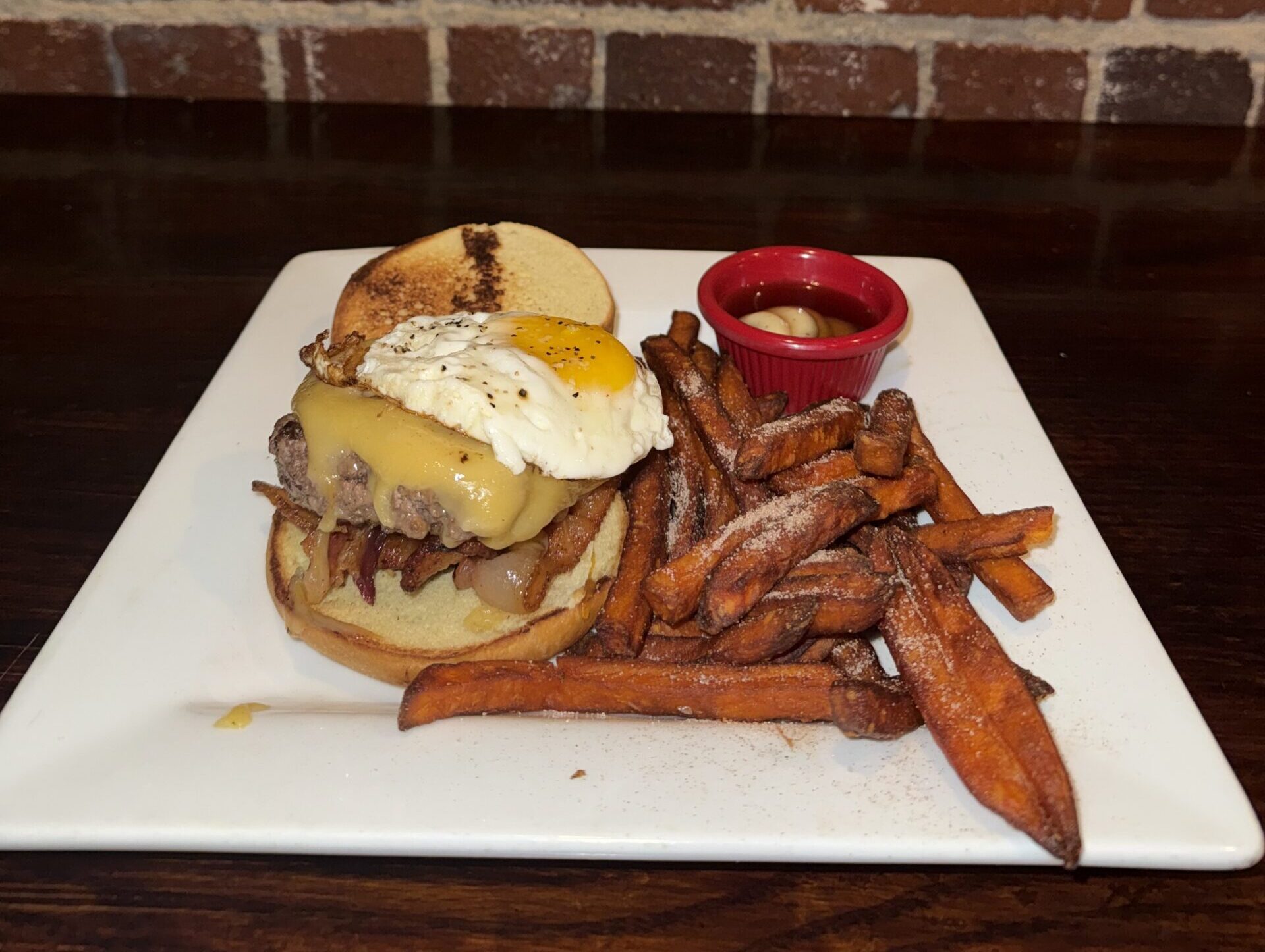 Fresh ground burger topped with melted Gouda cheese, caramelized onions, bacon, fried egg and roasted garlic aioli