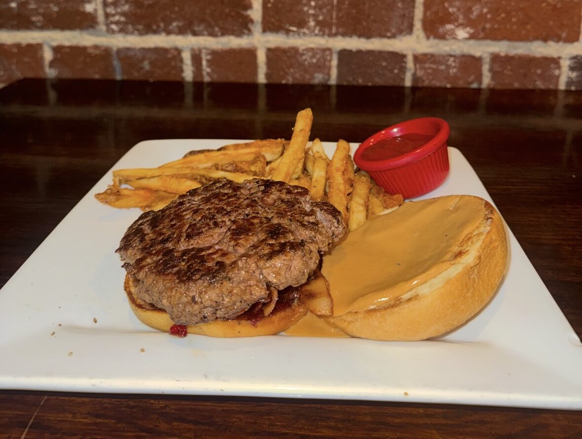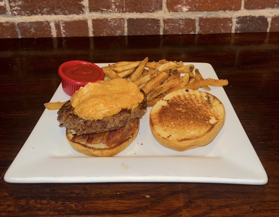 Fresh ground burger topped with crispy bacon and house-made pimento cheese