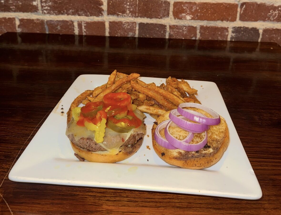 Fresh ground burger topped with melted white cheddar cheese, jalapenos, banana peppers and red onions, then covered with our house-made firestarter sauce