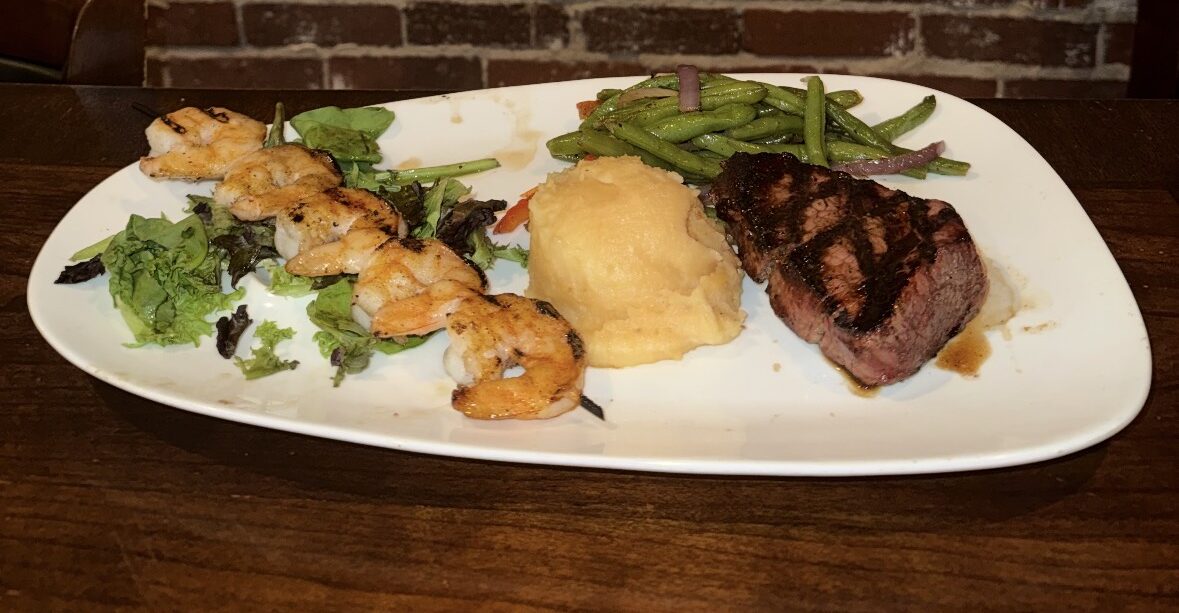 Center-cut Certified Angus Beef filet mignon with grilled jumbo shrimp skewer served with mashed potatoes and seasonal sautéed vegetables