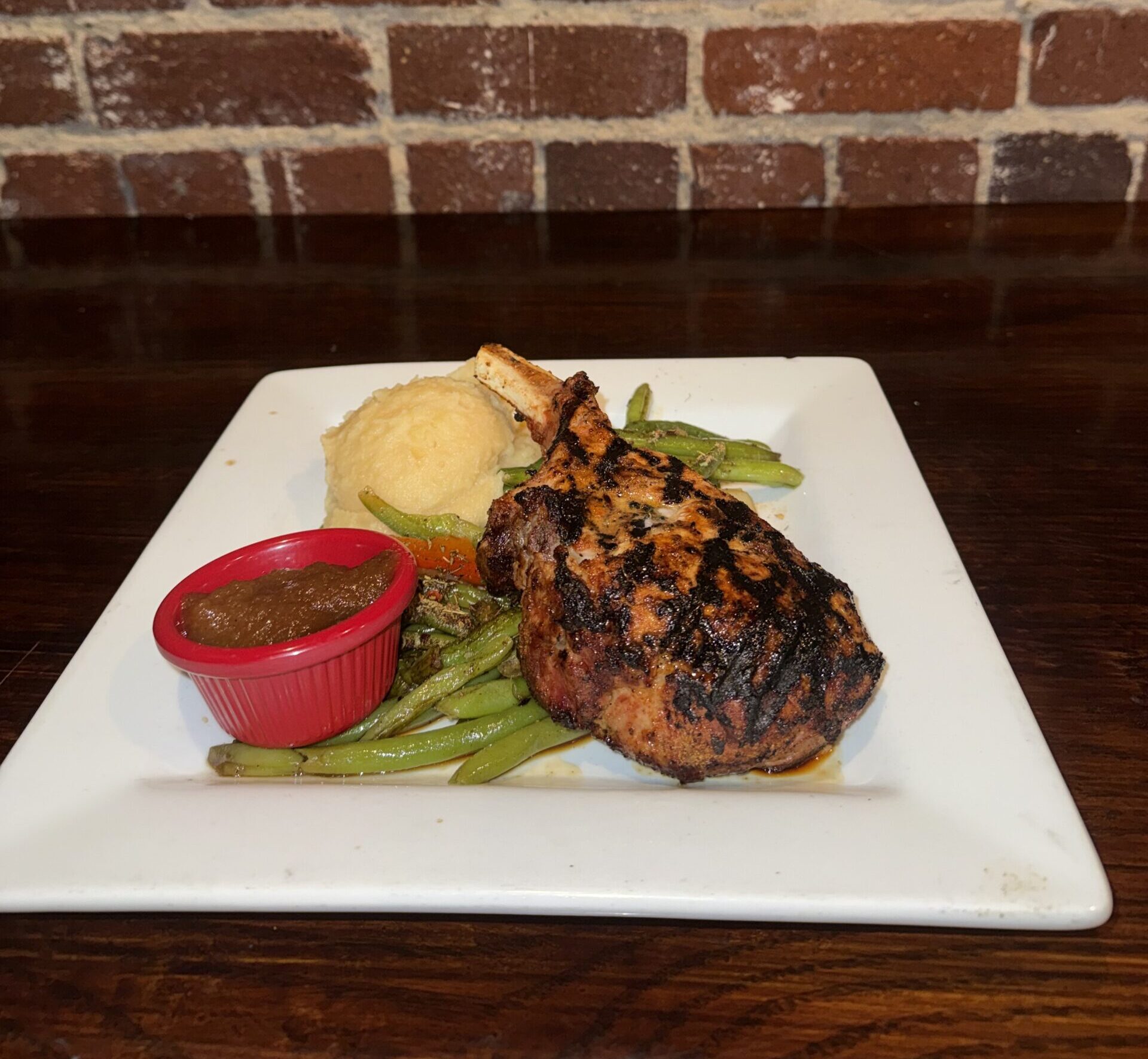 French bone-in pork chop topped with our Fuji apple chutney and served with mashed potatoes and seasonal sautéed vegetables
