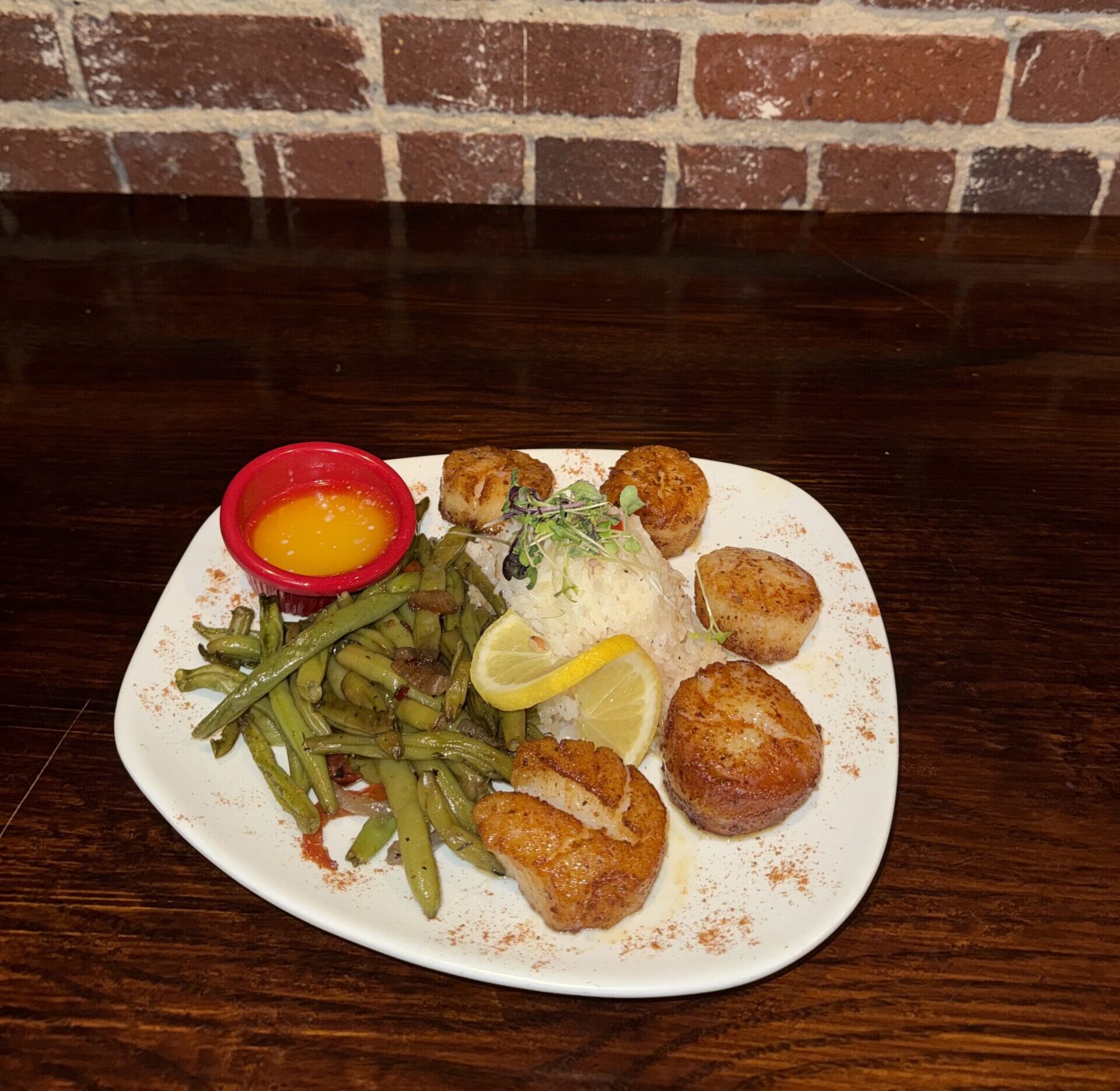 Golden-crusted sea scallops served over rice pilaf and seasonal sautéed vegetables
