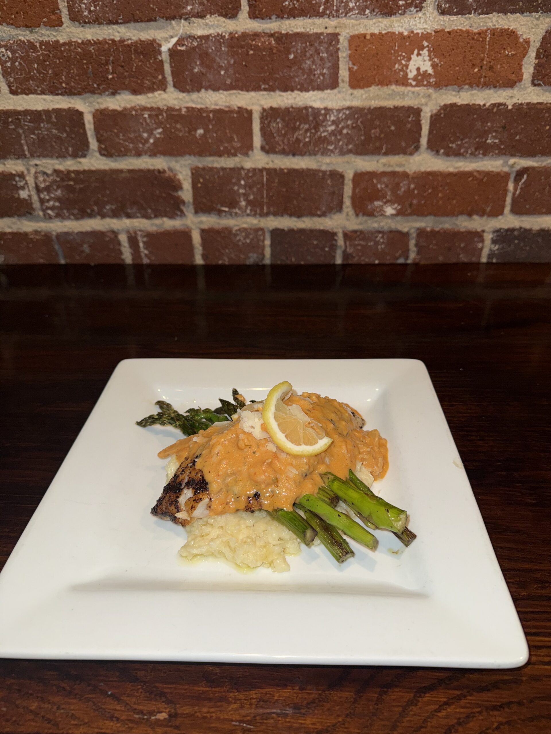 Grilled Red Snapper topped with a lobster cream sauce served with Parmesan risotto and grilled asparagus.
