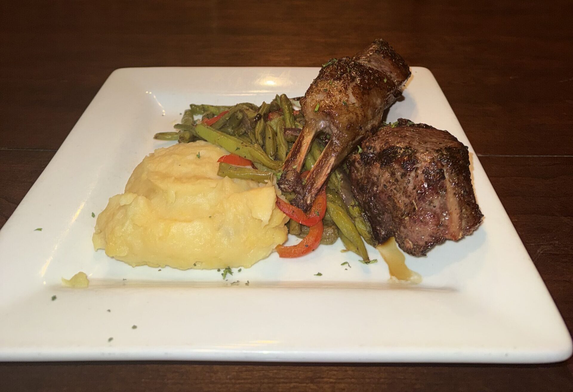 A half rack of grilled Australian lamb paired with a house-made mustard thyme sauce served with mashed potatoes and seasonal vegetables