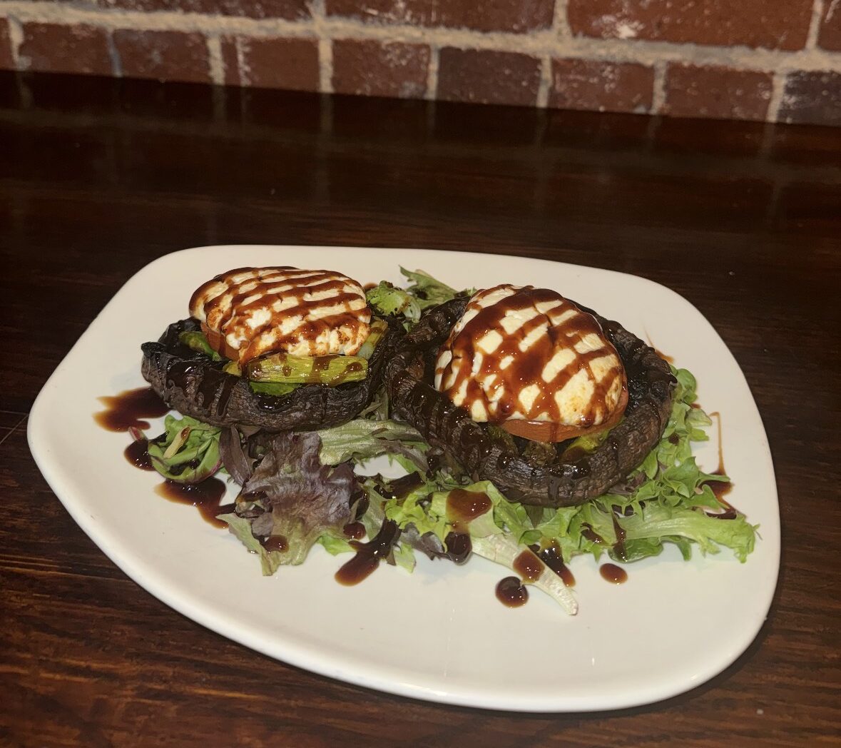 Large grilled Portobello Mushroom stuffed with goat cheese, asparagus, and tomatoes with a drizzle of balsamic reduction