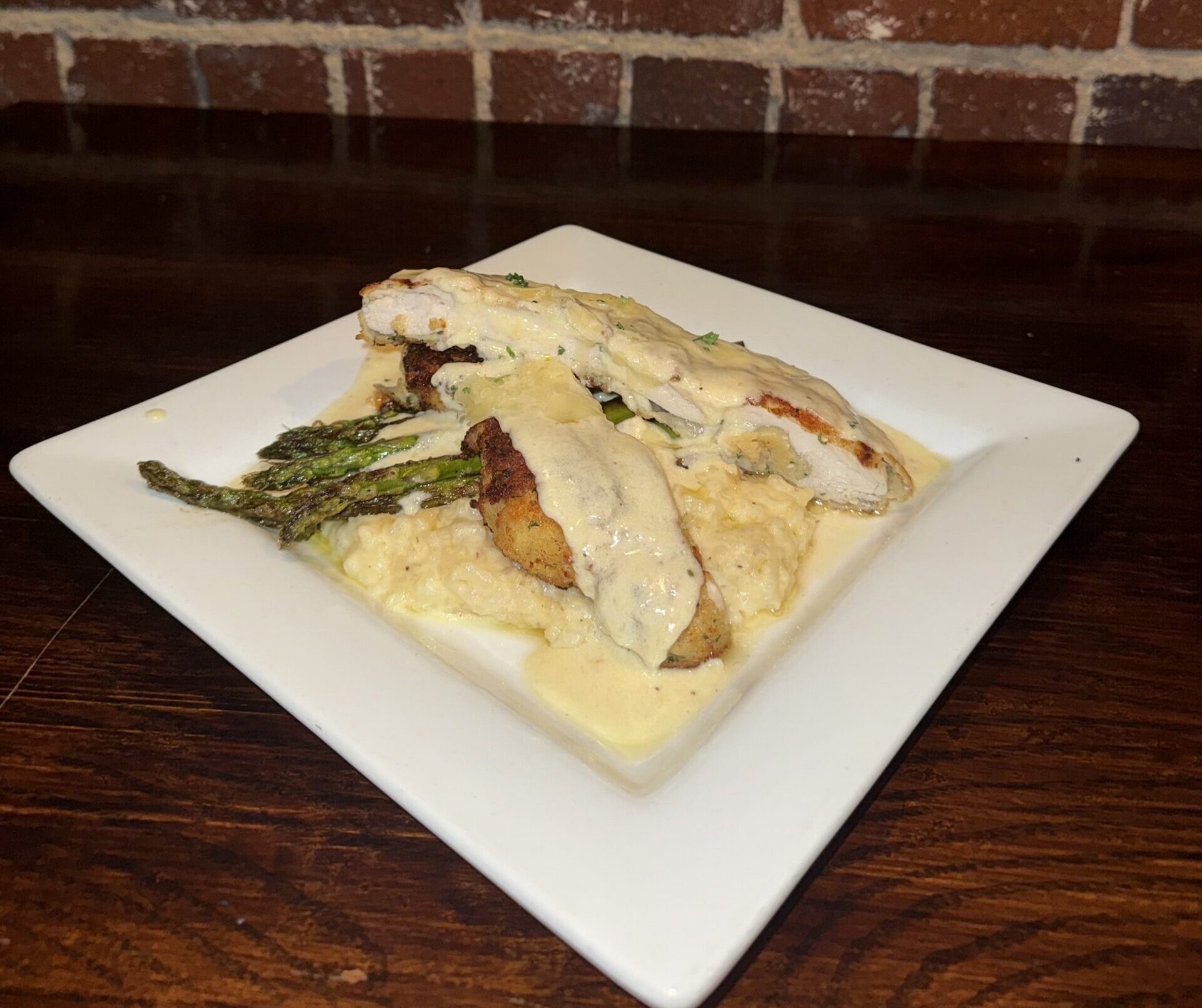Parmesan panko encrusted all-natural chicken breast and grilled asparagus over Parmesan risotto and cream sauce