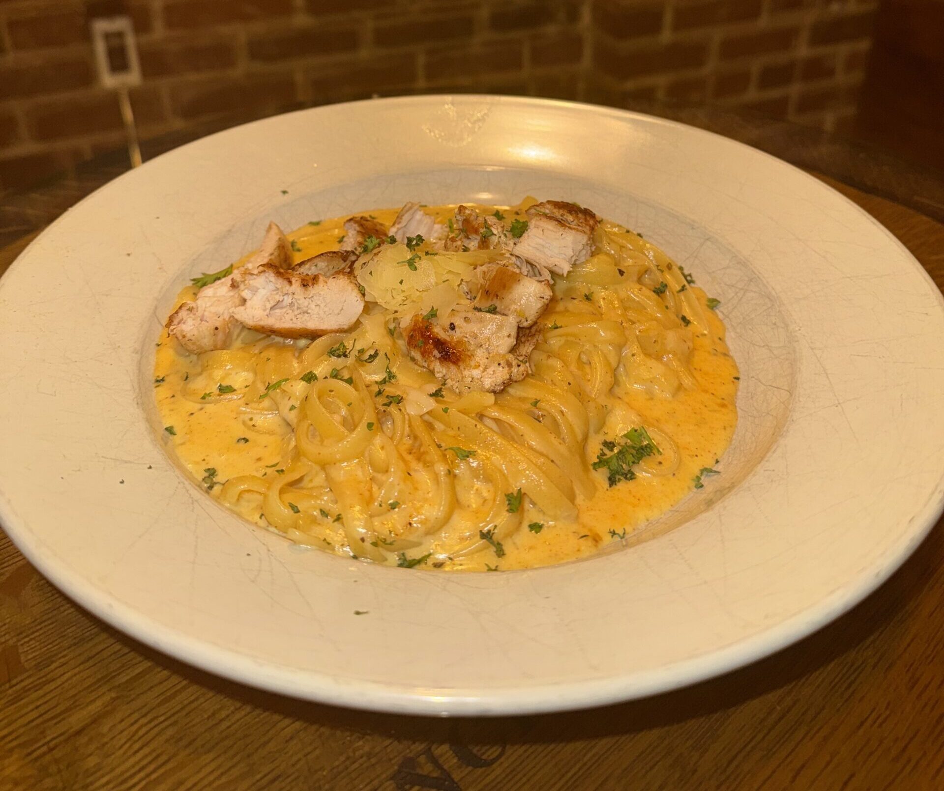 A bed of fettuccine noodles with a Cajun cream sauce