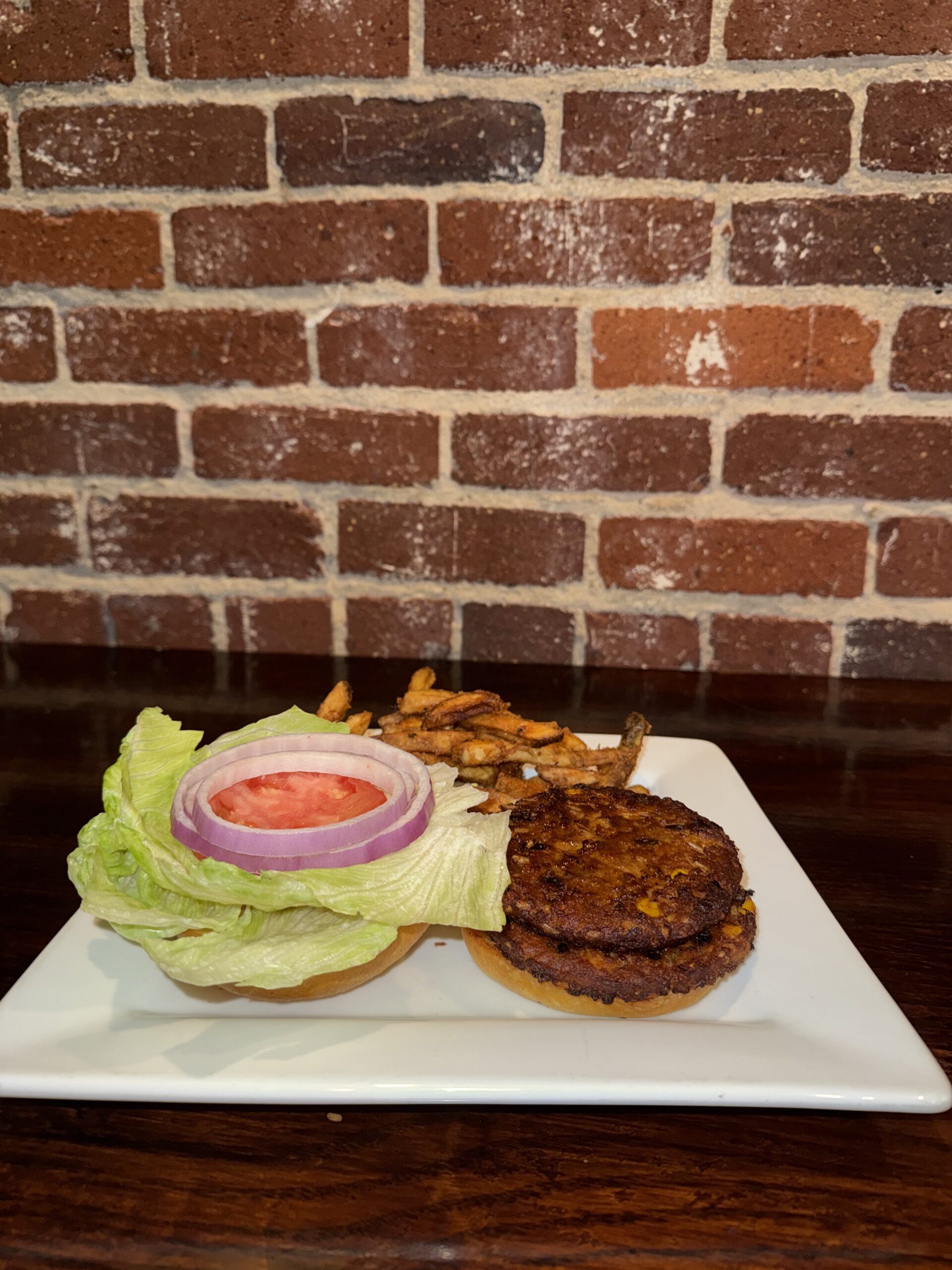 Black Bean vegetarian burger topped with lettuce, tomato, and red onion served with french fries.