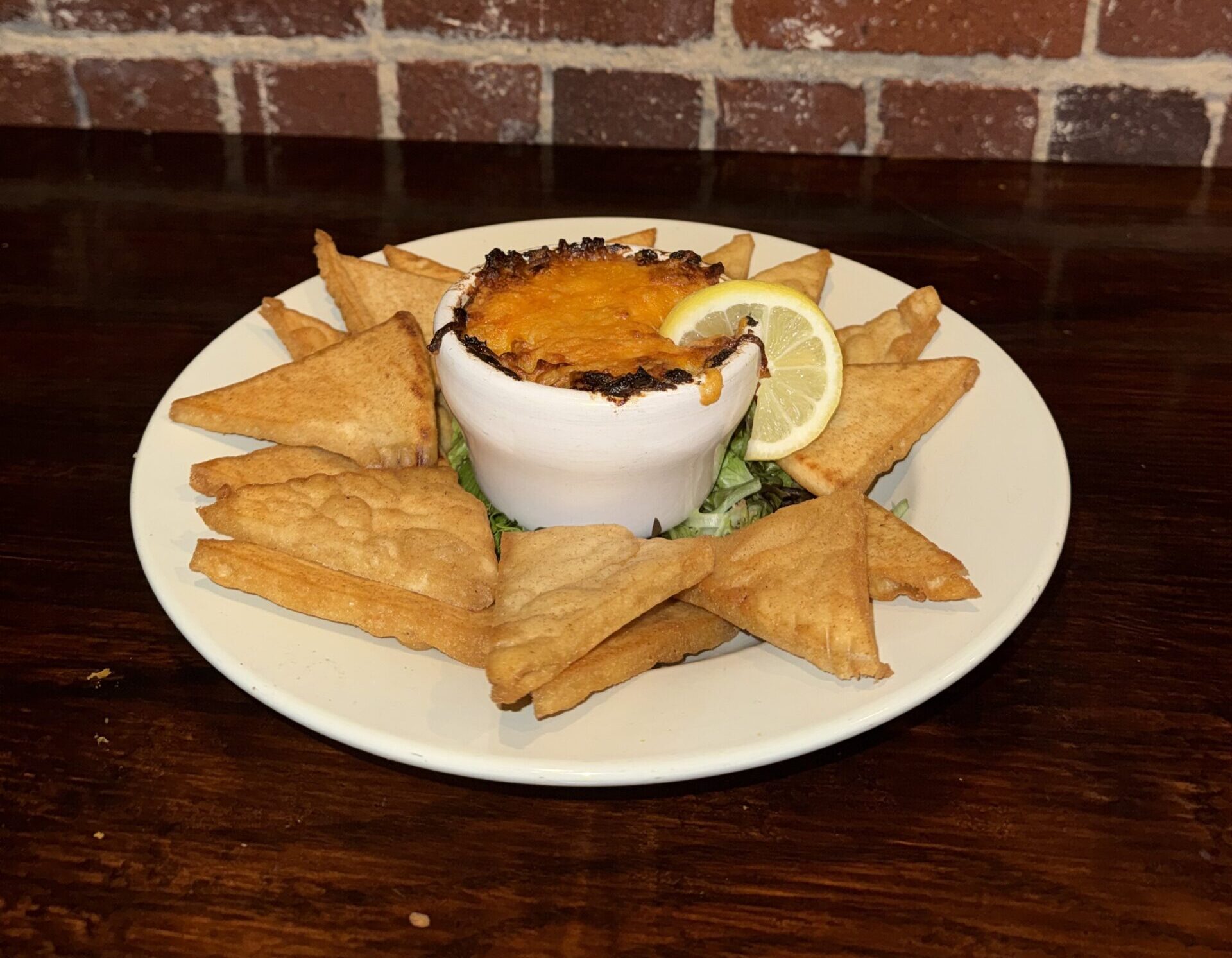 House-made crab and artichoke dip served with fried pita