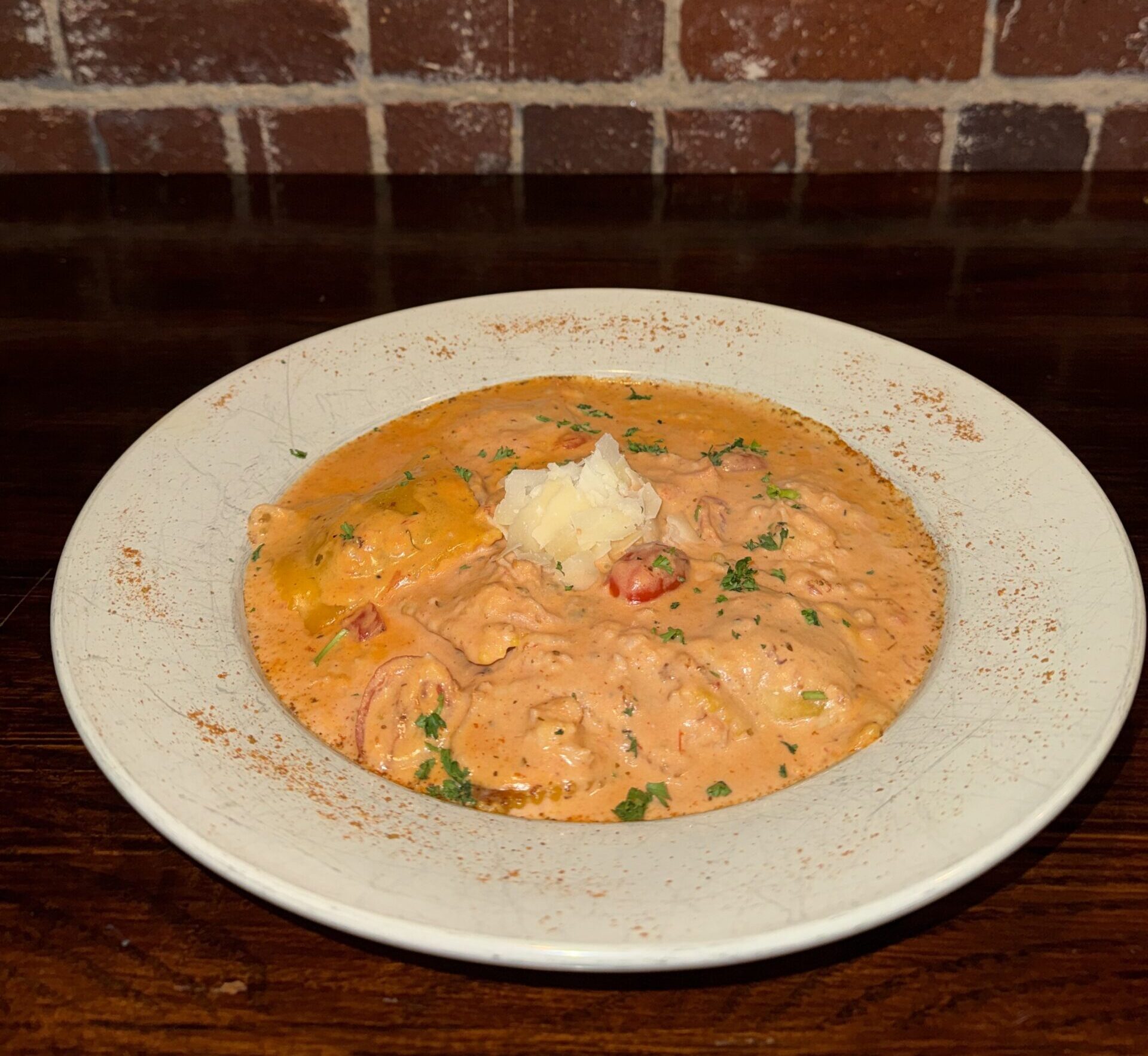 Lobster ravioli in a vodka cream sauce topped with poached lobster meat