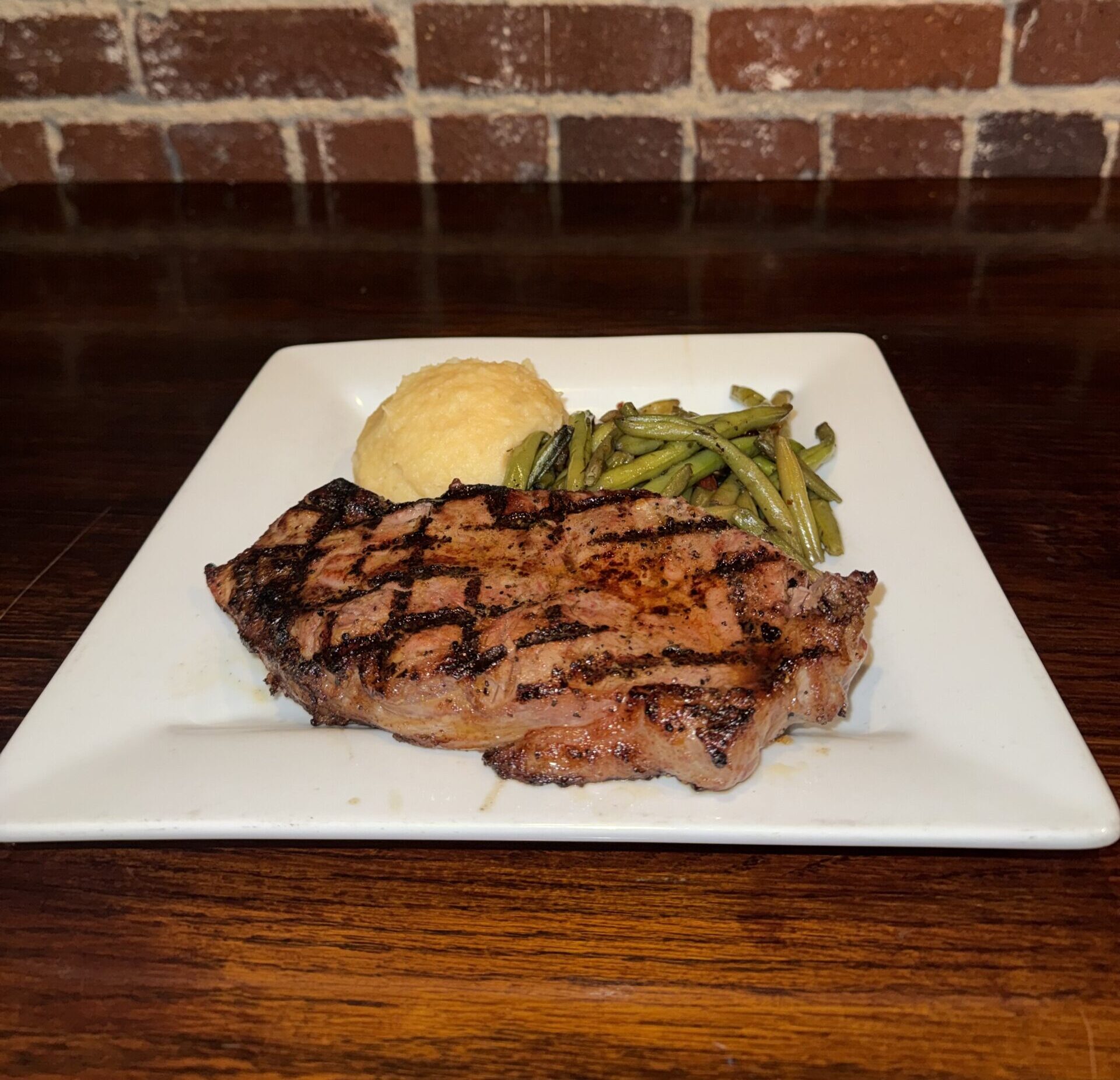 16oz Certified Angus Beef center-cut strip steak served with mashed potatoes and seasonal sautéed vegetables