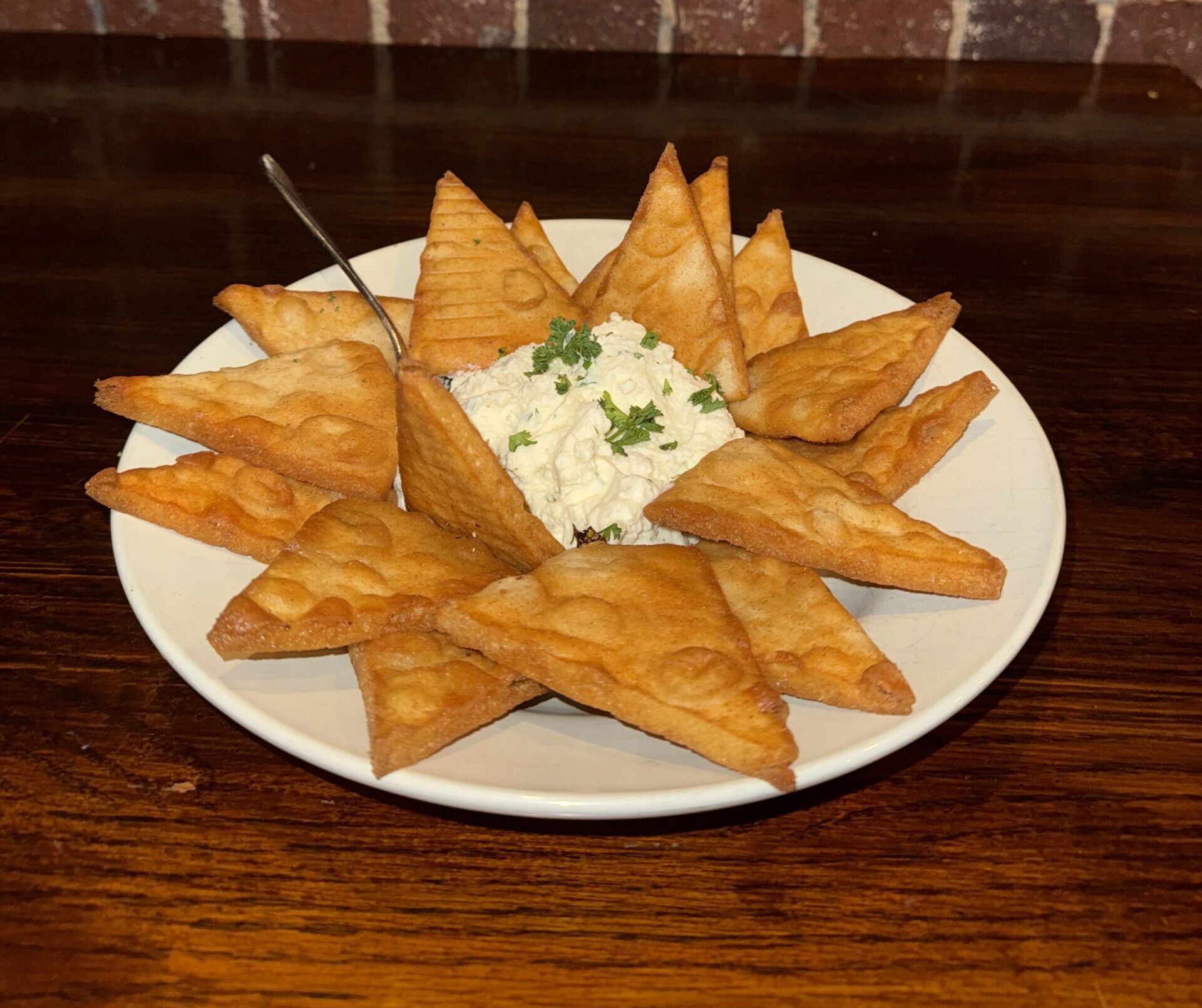 Creamy and flavorful blend of garlic, lemon juice, and herb whipped ricotta spread served with fried pita