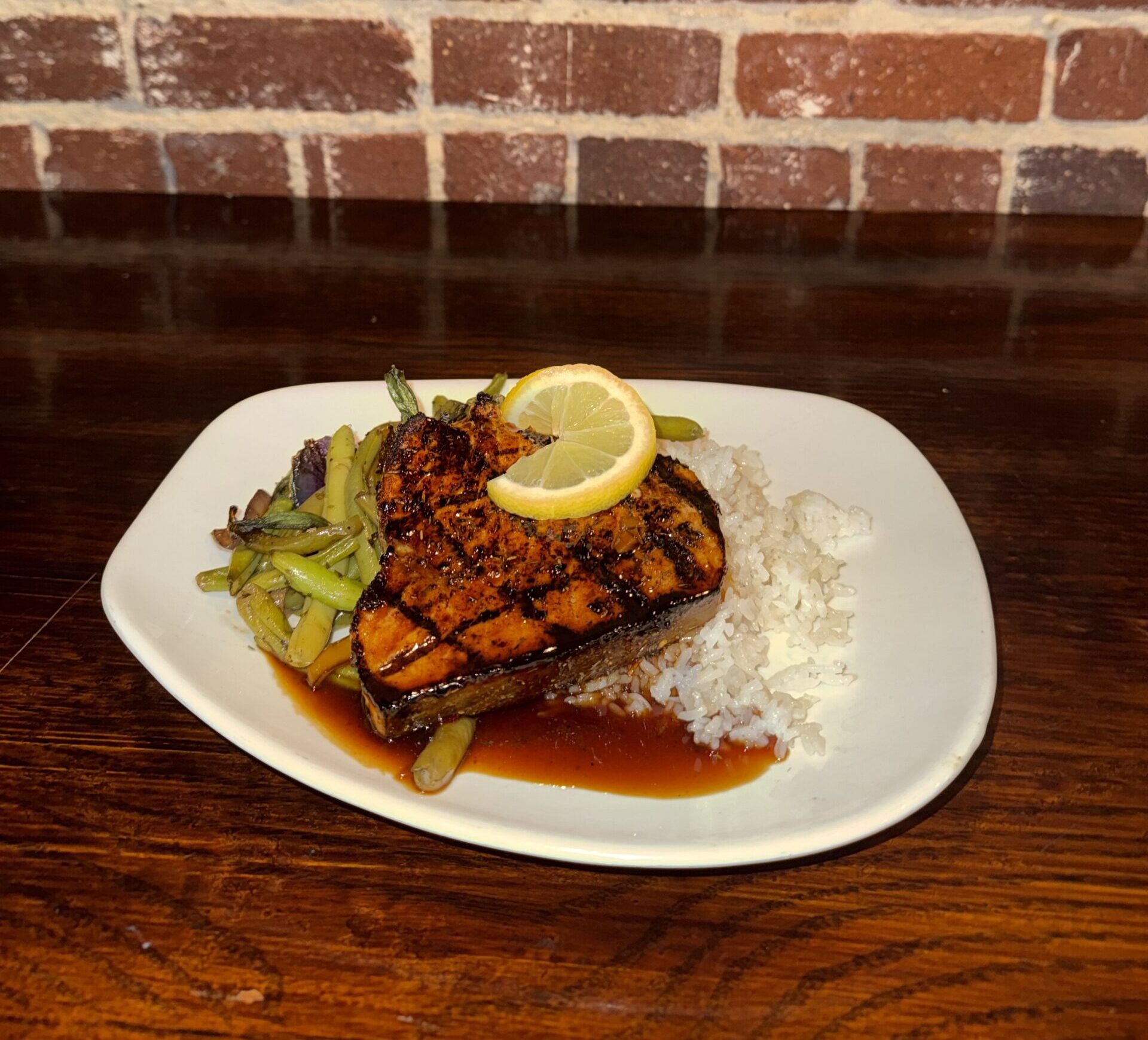 Grilled bourbon-glazed swordfish served over rice pilaf and seasonal sautéed vegetables